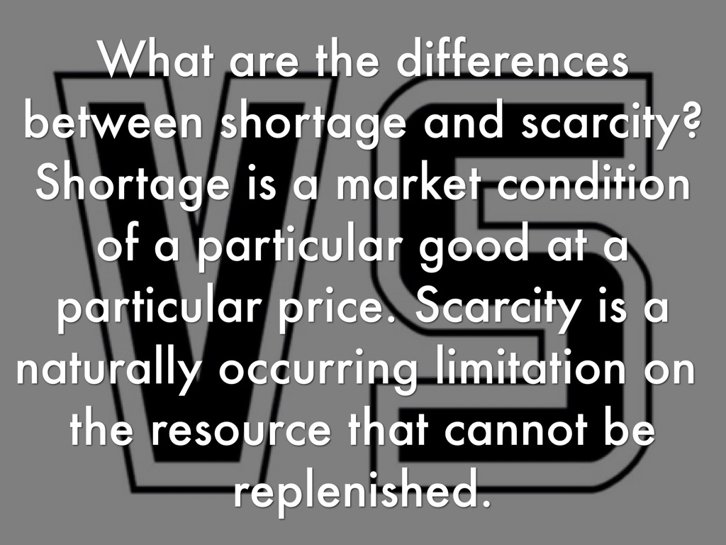 Shortage is a market condition of a particular good at a particular price. Scarcity is a naturally occurring limitation on the resource that cannot be replenished.