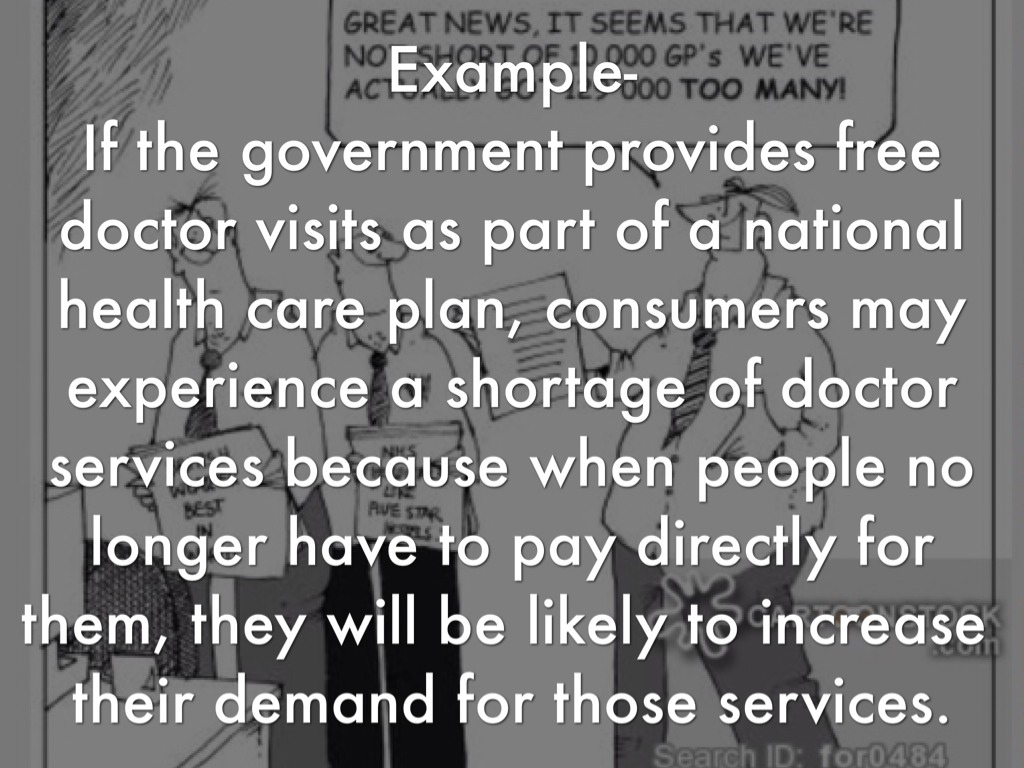 If the government provides free doctor visits as part of a national health care plan, consumers may experience a shortage of doctor services because when people no longer have to pay directly for them, they will be likely to increase their demand for those services.