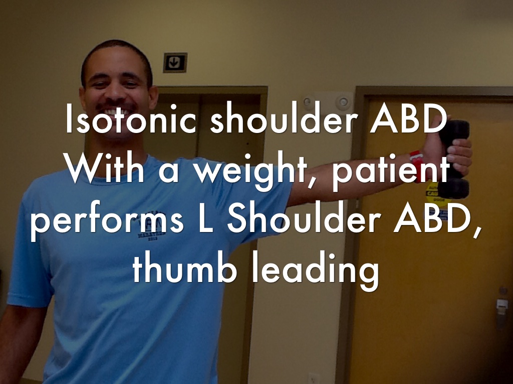 With a weight, patient performs L Shoulder ABD, thumb leading