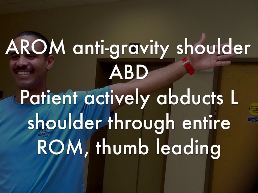 Patient is supine (gravity eliminated position), and actively abducts L arm through full ROM, thumb leading