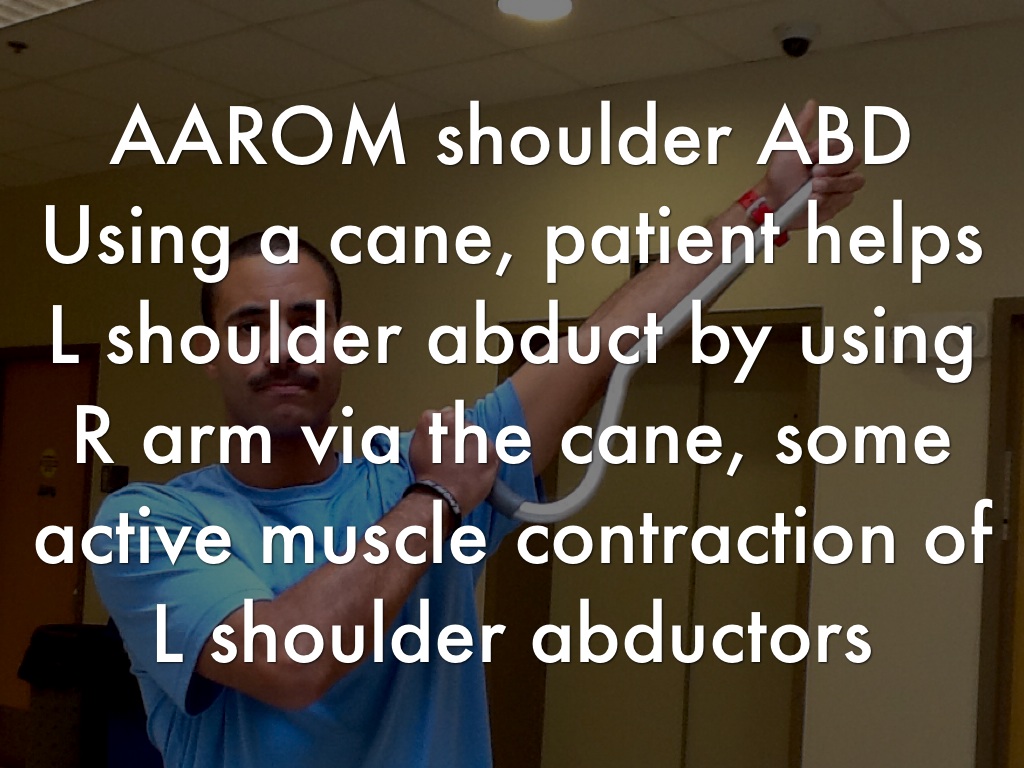 Using a cane, patient helps L shoulder abduct by using R arm via the cane, some active muscle contraction of L shoulder abductors