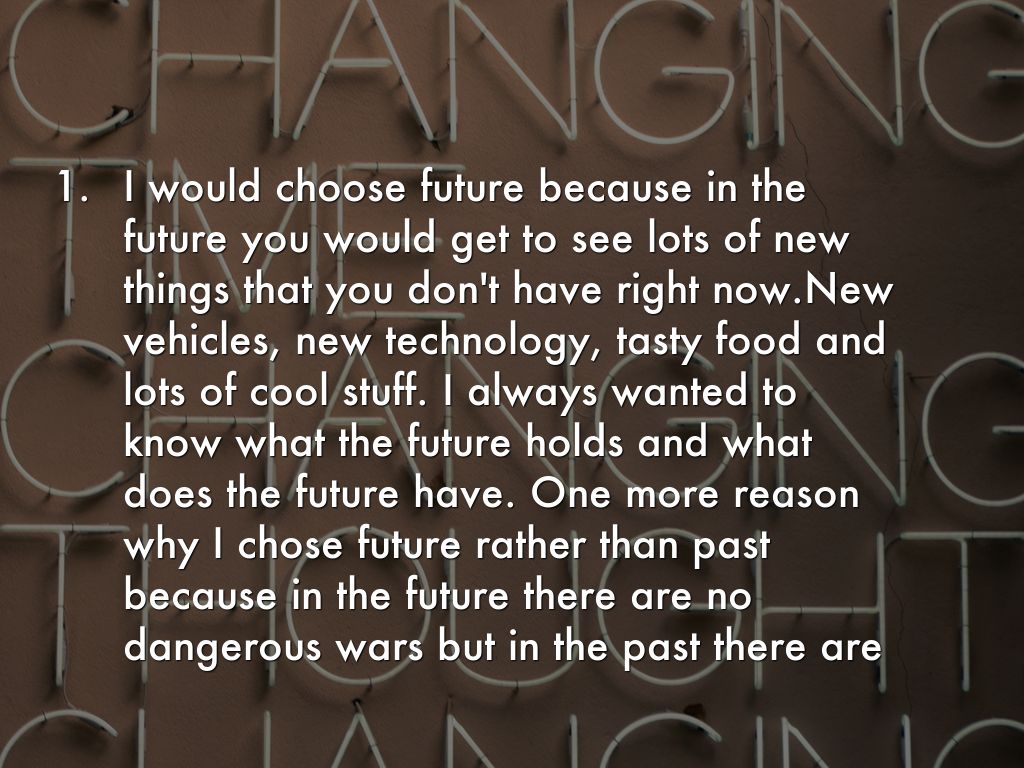 - I would choose future because in the future you would get to see lots of new things that you don't have right now.New vehicles, new technology, tasty food and lots of cool stuff. I always wanted to know what the future holds and what does the future have. One more reason why I chose future rather than past because in the future there are no dangerous wars but in the past there are world war 1 and 2 so, it's dangerous to go to past.