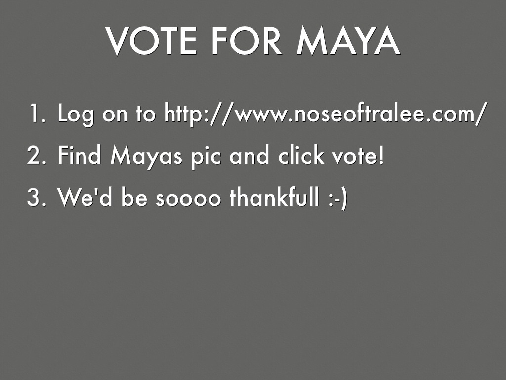 Maya is a finalist in the Nose of Tralee, she would love to get some votes! http://www.noseoftralee.com/