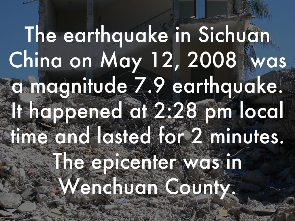 The earthquake in Sichuan China on May 12, 2008 was a magnitude 7.9 earthquake. It happened at 2:28 pm local time and lasted for 2 minutes. The epicenter was in Wenchuan County.