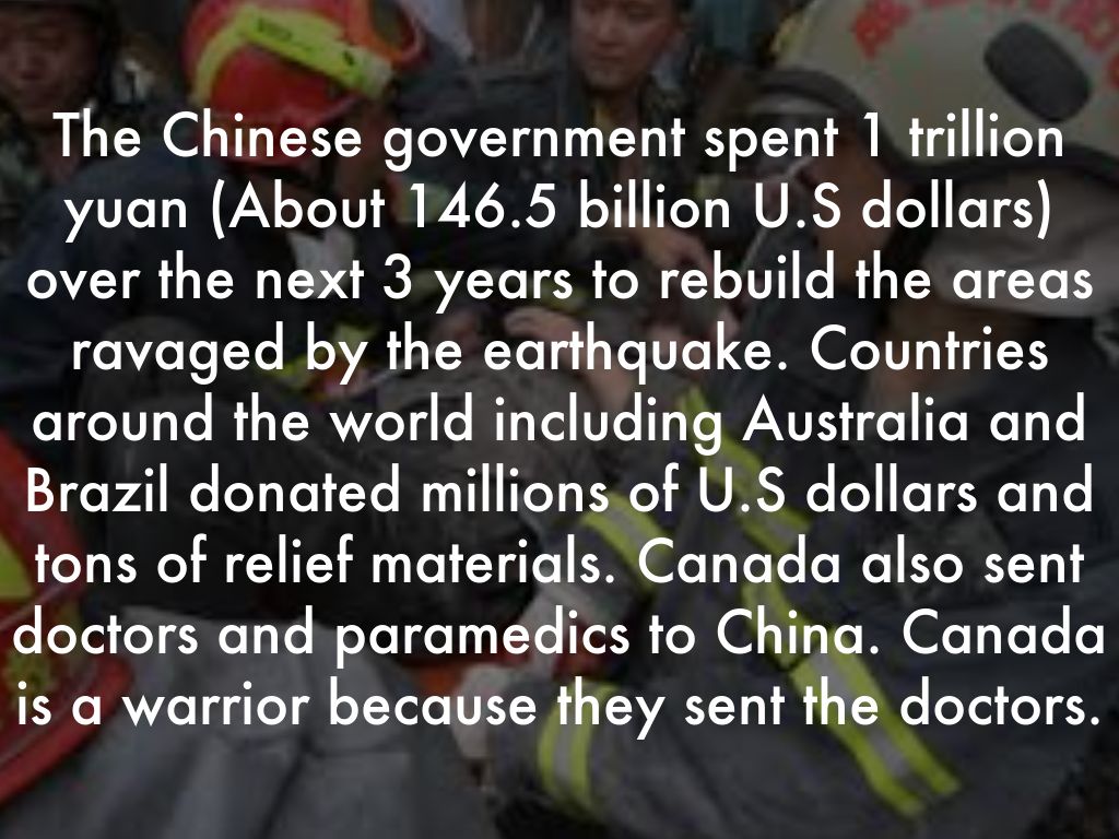 The Chinese government spent 1 trillion yuan (About 146.5 billion U.S dollars) over the next 3 years to rebuild the areas ravaged by the earthquake. Countries around the world including Australia and Brazil donated millions of U.S dollars and tons of relief materials. Canada also sent doctors and paramedics to China. Canada is a warrior because they sent the doctors.