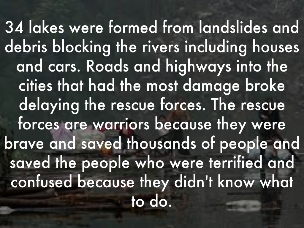 34 lakes were formed from landslides and debris blocking the rivers including houses and cars. Roads and highways into the cities that had the most damage broke delaying the rescue forces. The rescue forces are warriors because they were brave and saved thousands of people and saved the people who were terrified and confused because they didn't know what to do.