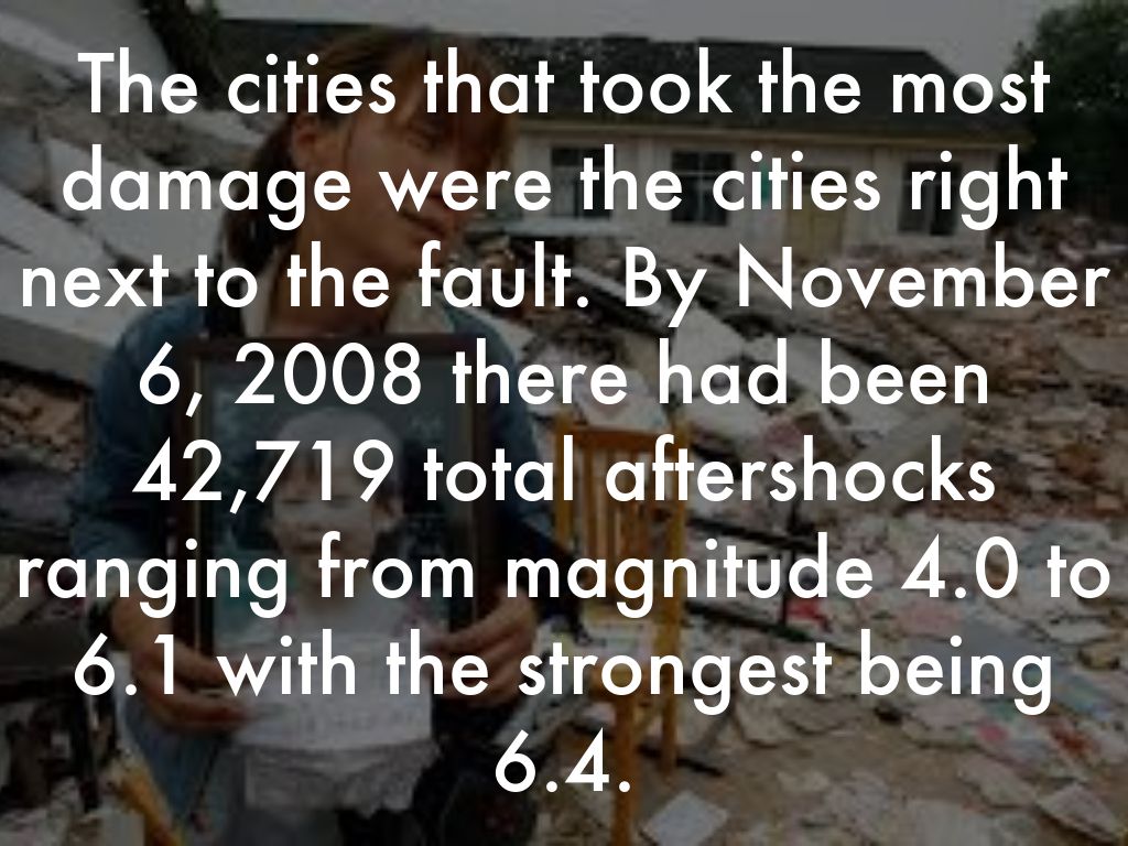 The cities that took the most damage were the cities right next to the fault. By November 6, 2008 there had been 42,719 total aftershocks ranging from magnitude 4.0 to 6.1 with the strongest being 6.4.