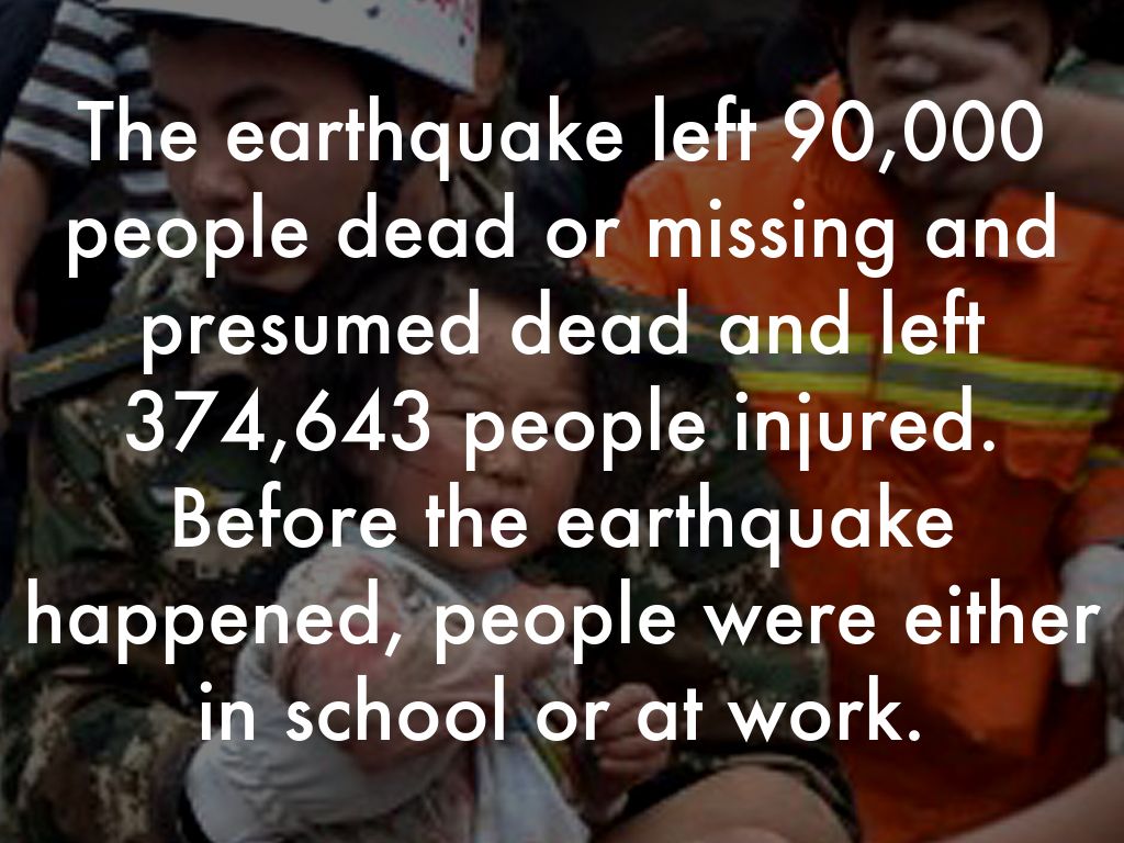 The earthquake left 90,000 people dead or missing and presumed dead and left 374,643 people injured. Before the earthquake happened, people were either in school or at work.