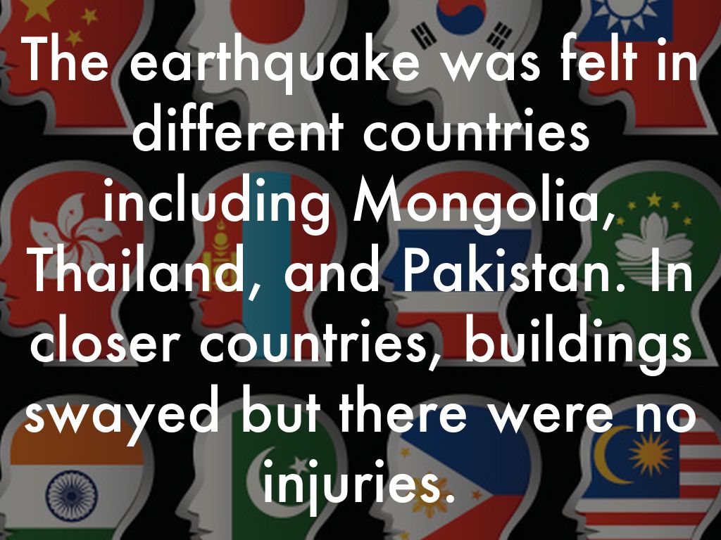 The earthquake was felt in different countries including Mongolia, Thailand, and Pakistan. In closer countries, buildings swayed but there were no injuries.