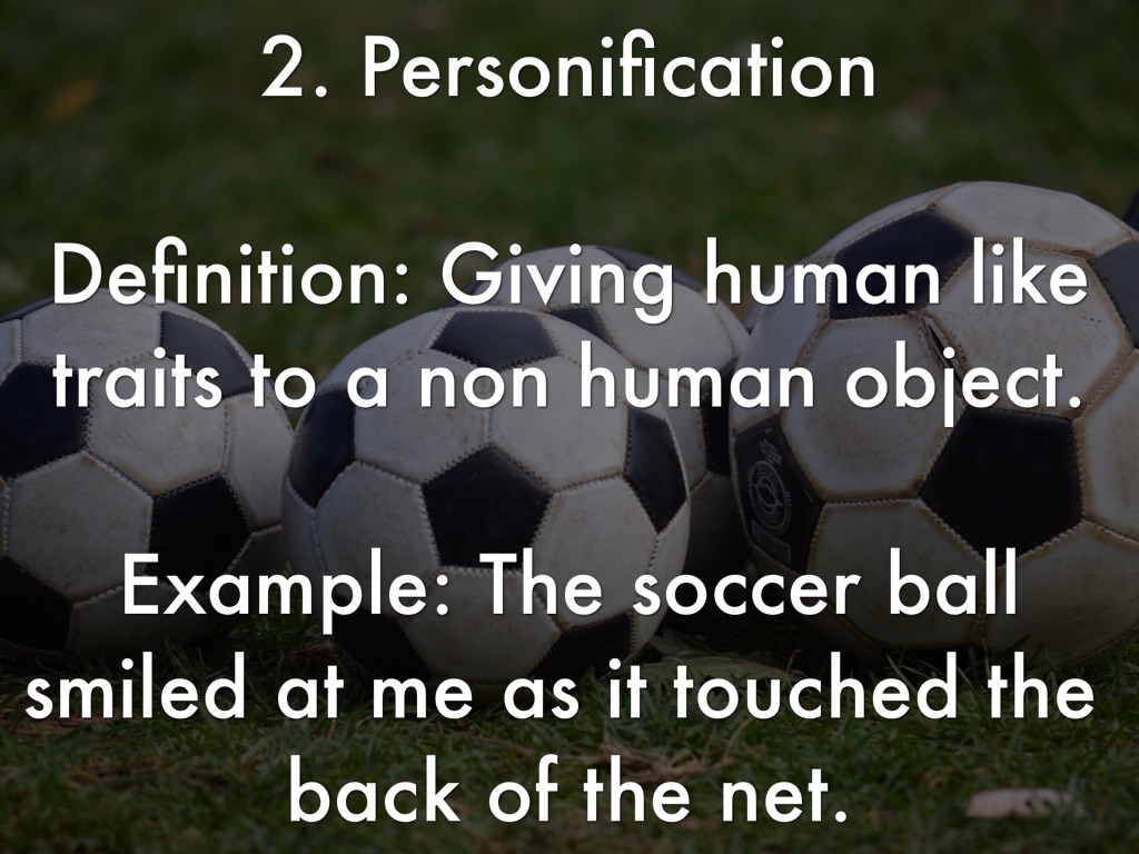 Example: The soccer ball smiled at me as it touched the back of the net.