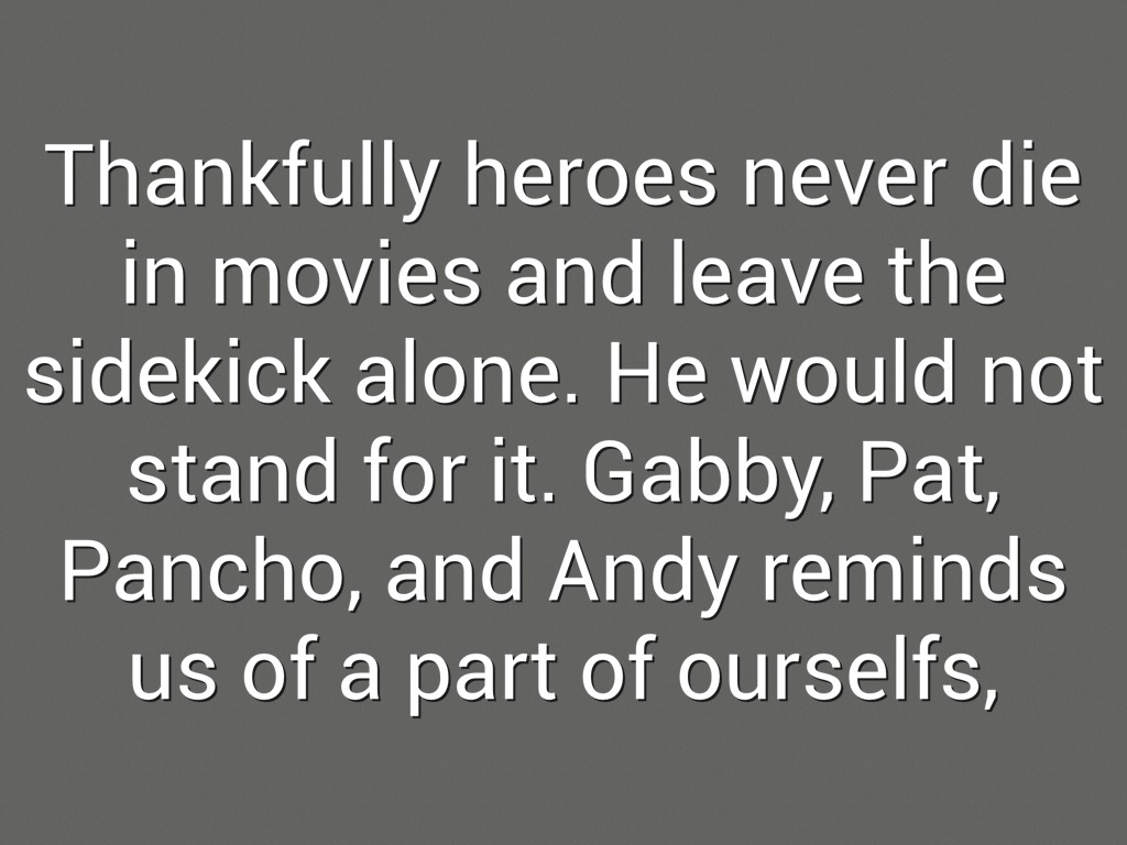 Thankfully heroes never die in movies and leave the sidekick alone. He would not stand for it. Gabby, Pat, Pancho, and Andy reminds us of a part of ourselfs,
