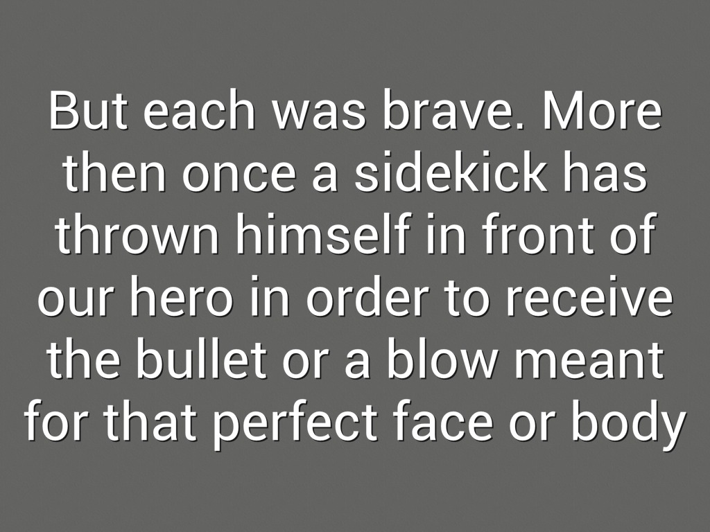 But each was brave. More then once a sidekick has thrown himself in front of our hero in order to receive the bullet or a blow meant for that perfect face or body