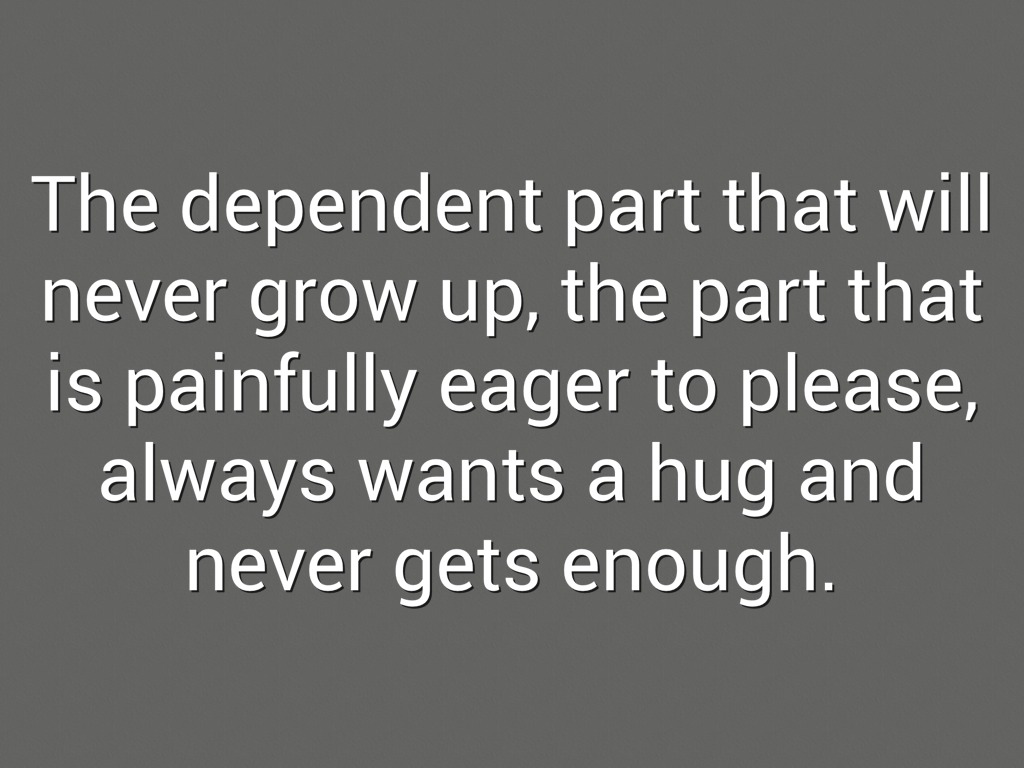 The dependent part that will never grow up, the part that is painfully eager to please, always wants a hug and never gets enough.