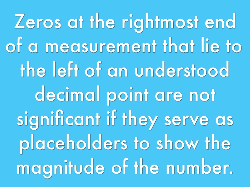 Zeros at the rightmost end of a measurement that lie to the left of an understood decimal point are not significant if they serve as placeholders to show the magnitude of the number.