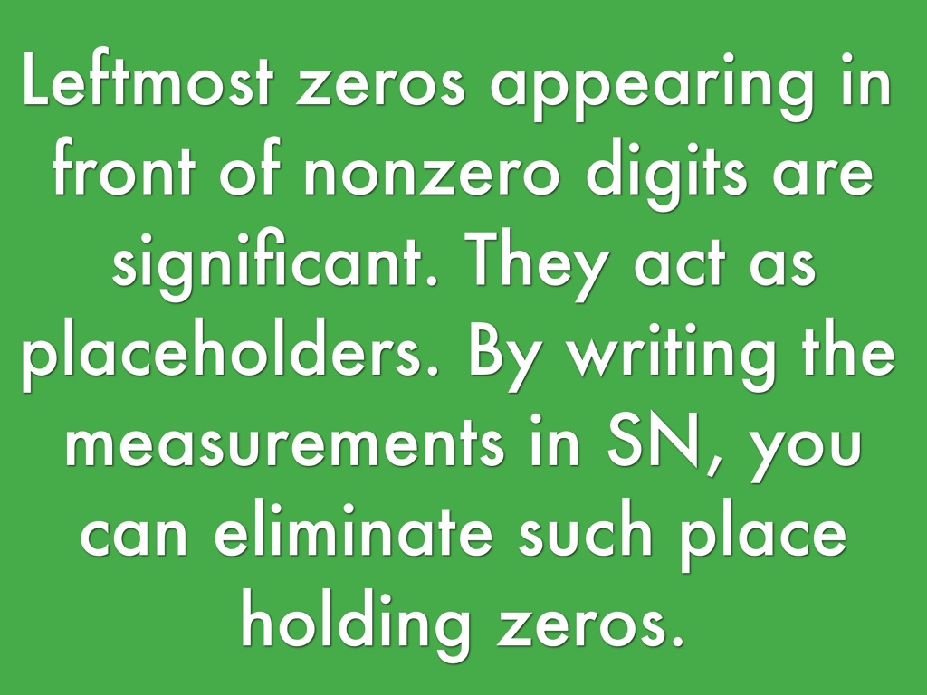 Leftmost zeros appearing in front of nonzero digits are significant. They act as placeholders. By writing the measurements in SN, you can eliminate such place holding zeros.