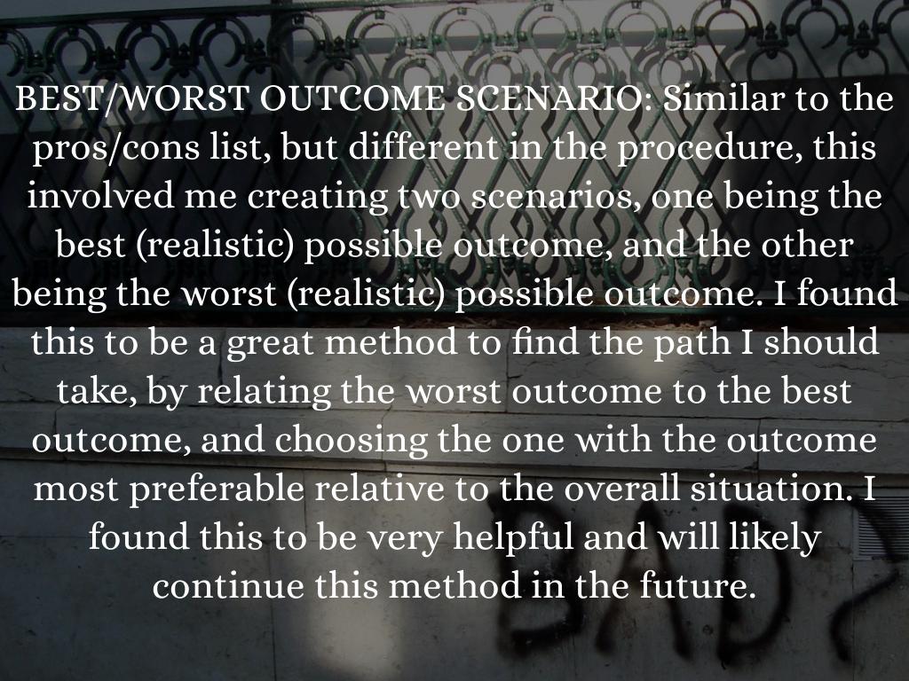 BEST/WORST OUTCOME SCENARIO: Similar to the pros/cons list, but different in the procedure, this involved me creating two scenarios, one being the best (realistic) possible outcome, and the other being the worst (realistic) possible outcome. I found this to be a great method to find the path I should take, by relating the worst outcome to the best outcome, and choosing the one with the outcome most preferable relative to the overall situation. I found this to be very helpful and will likely continue this method in the future.