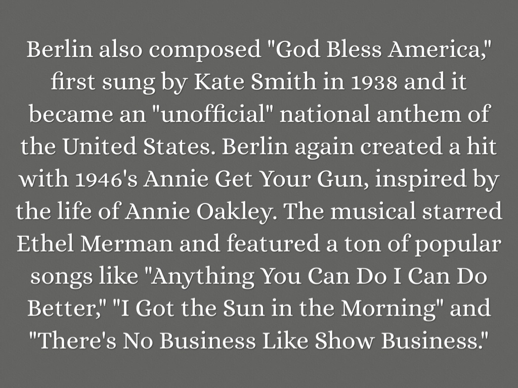 Berlin also composed "God Bless America," first sung by Kate Smith in 1938 and it became an "unofficial" national anthem of the United States. Berlin again created a hit with 1946's Annie Get Your Gun, inspired by the life of Annie Oakley. The musical starred Ethel Merman and featured a ton of popular songs like "Anything You Can Do I Can Do Better," "I Got the Sun in the Morning" and "There's No Business Like Show Business."