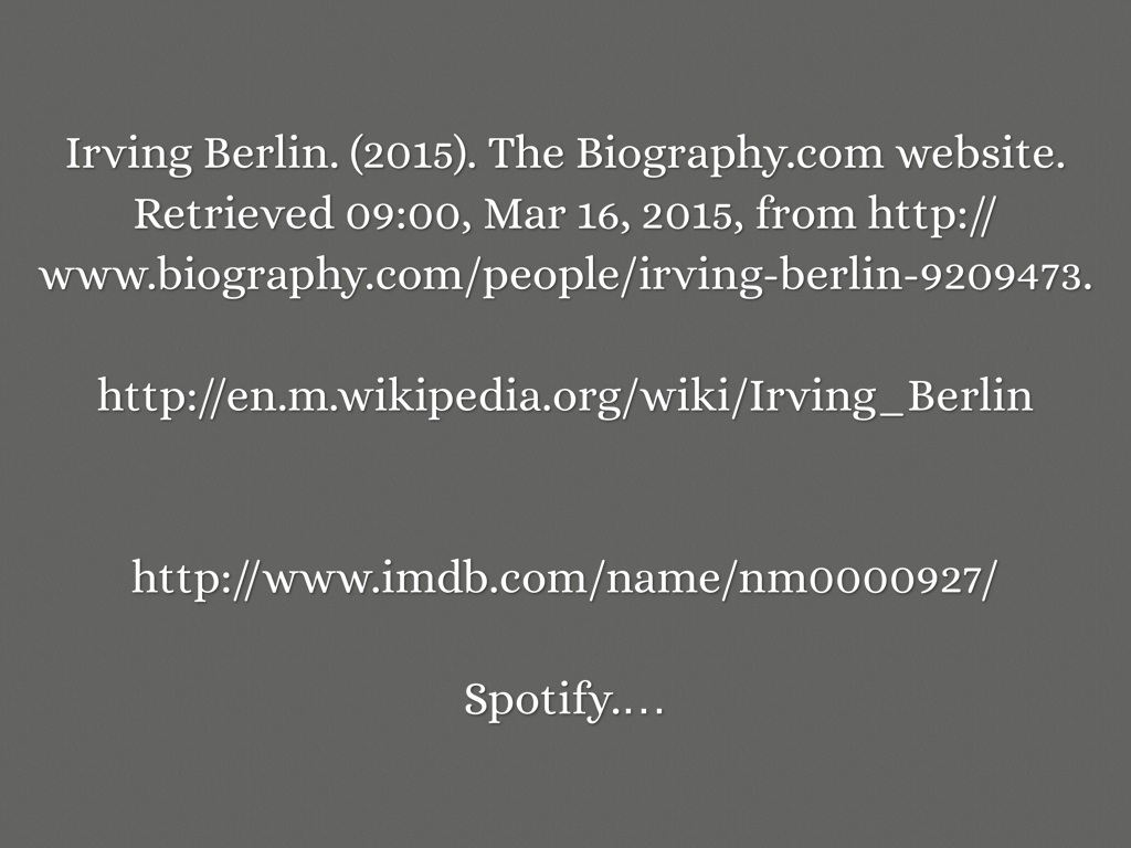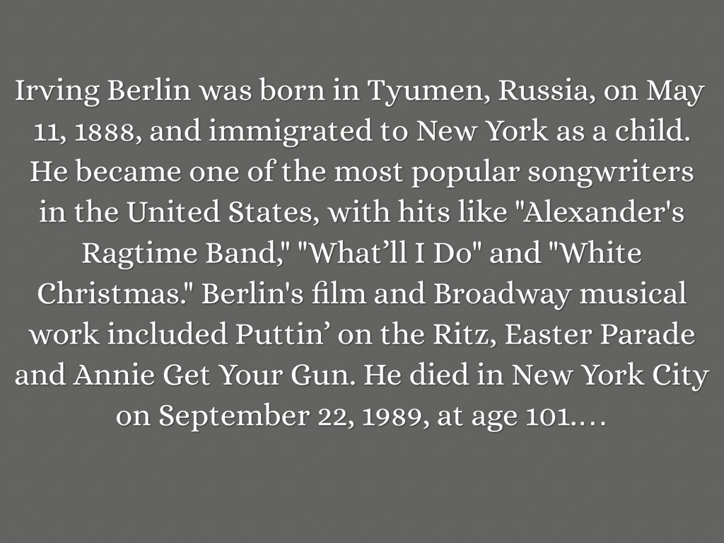 Irving Berlin was born in Tyumen, Russia, on May 11, 1888, and immigrated to New York as a child. He became one of the most popular songwriters in the United States, with hits like "Alexander's Ragtime Band," "What’ll I Do" and "White Christmas." Berlin's film and Broadway musical work included Puttin’ on the Ritz, Easter Parade and Annie Get Your Gun. He died in New York City on September 22, 1989, at age 101.