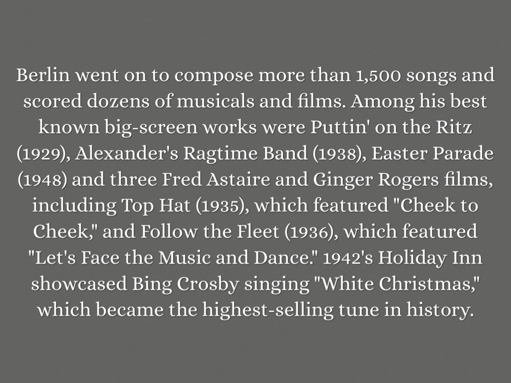 Berlin went on to compose more than 1,500 songs and scored dozens of musicals and films. Among his best known big-screen works were Puttin' on the Ritz (1929), Alexander's Ragtime Band (1938), Easter Parade (1948) and three Fred Astaire and Ginger Rogers films, including Top Hat (1935), which featured "Cheek to Cheek," and Follow the Fleet (1936), which featured "Let's Face the Music and Dance." 1942's Holiday Inn showcased Bing Crosby singing "White Christmas," which became the highest-selling tune in history.
