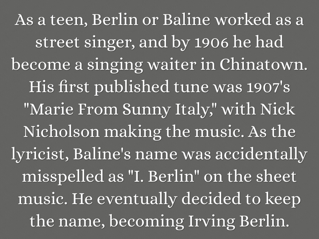 As a teen, Berlin or Baline worked as a street singer, and by 1906 he had become a singing waiter in Chinatown. His first published tune was 1907's "Marie From Sunny Italy," with Nick Nicholson making the music. As the lyricist, Baline's name was accidentally misspelled as "I. Berlin" on the sheet music. He eventually decided to keep the name, becoming Irving Berlin.