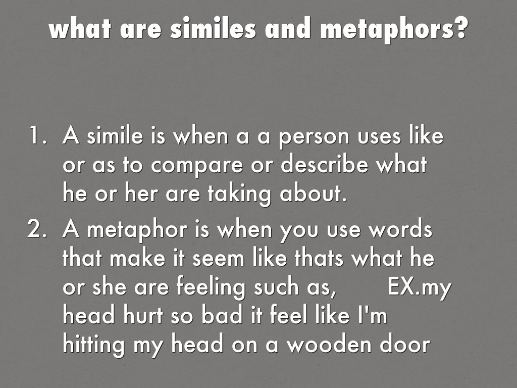 A metaphor is when you use words that make it seem like thats what he or she are feeling such as, EX.my head hurt so bad it feel like I'm hitting my head on a wooden door