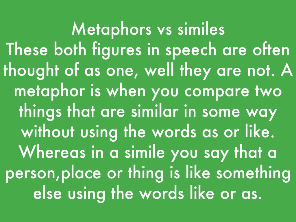 These both figures in speech are often thought of as one, well they are not. A metaphor is when you compare two things that are similar in some way without using the words as or like. Whereas in a simile you say that a person,place or thing is like something else using the words like or as.