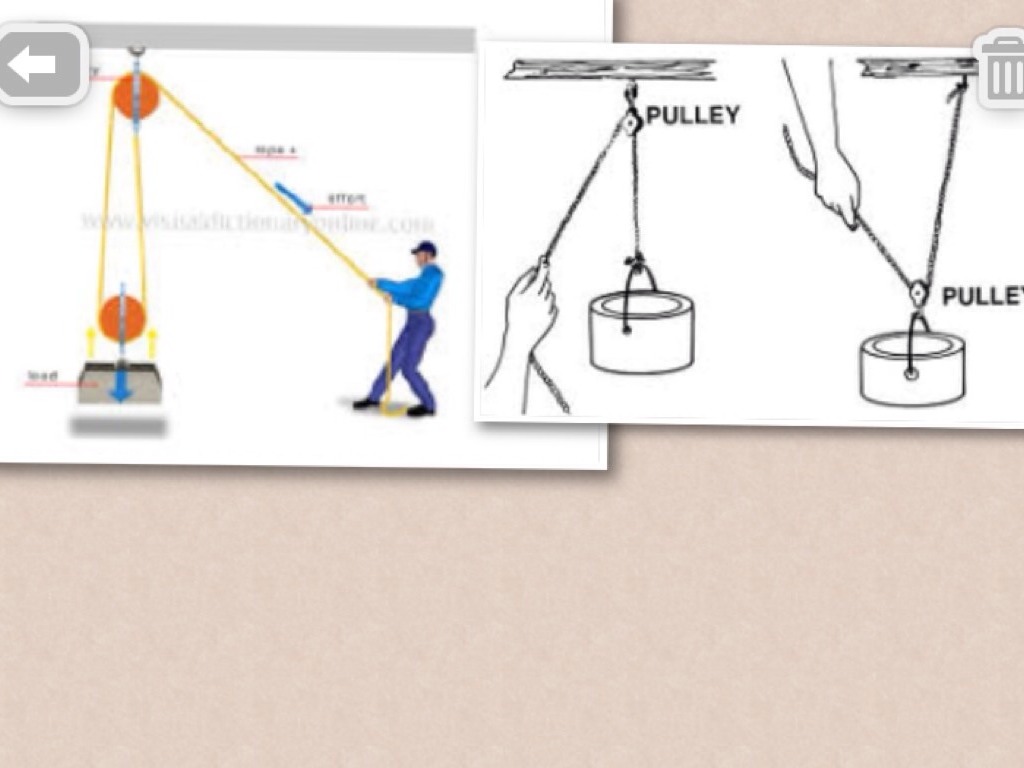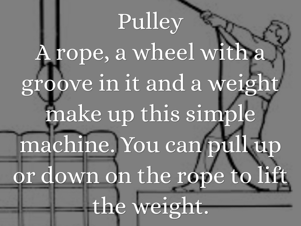 A rope, a wheel with a groove in it and a weight make up this simple machine. You can pull up or down on the rope to lift the weight.