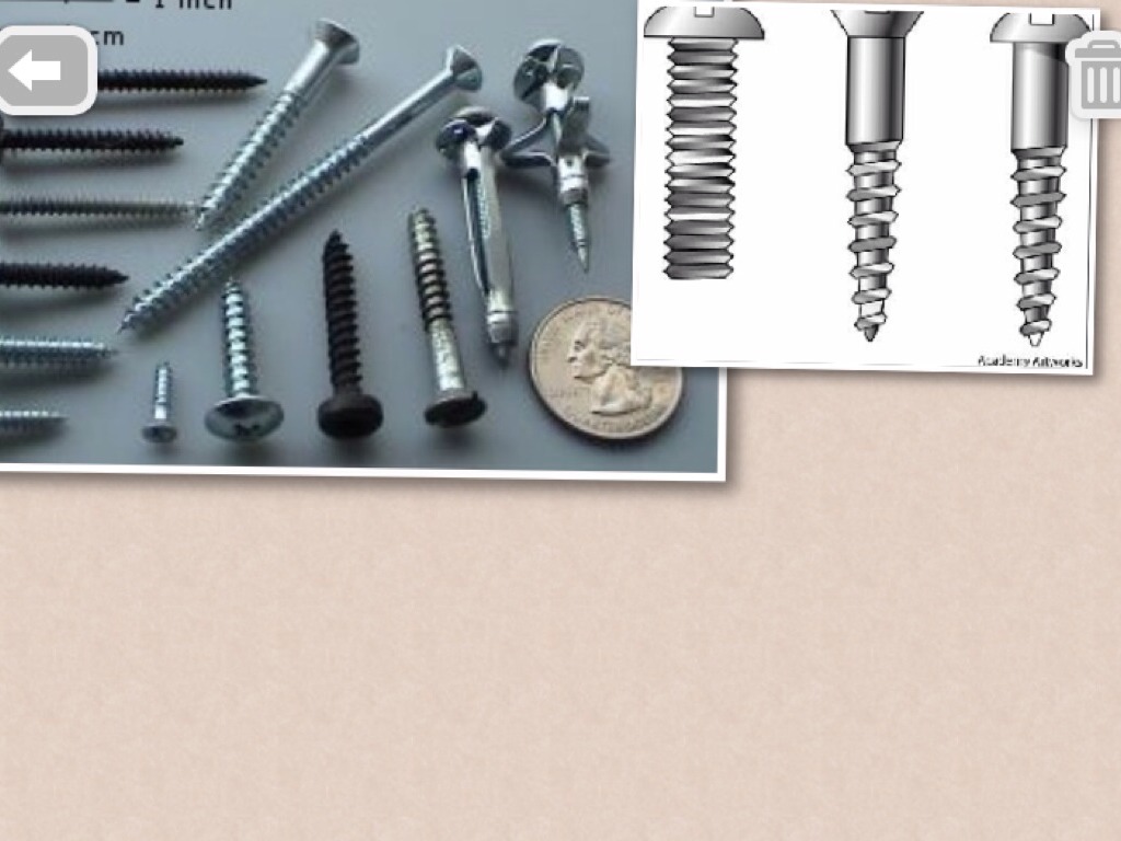 Examples of this simple machine are used to hold things together. It is made up of an inclined plane wrapped around a cylinder.