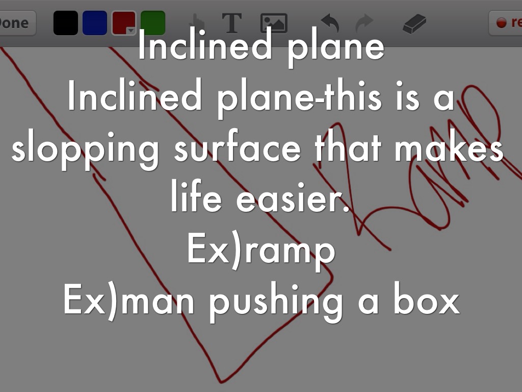 Inclined plane-this is a slopping surface that makes life easier.