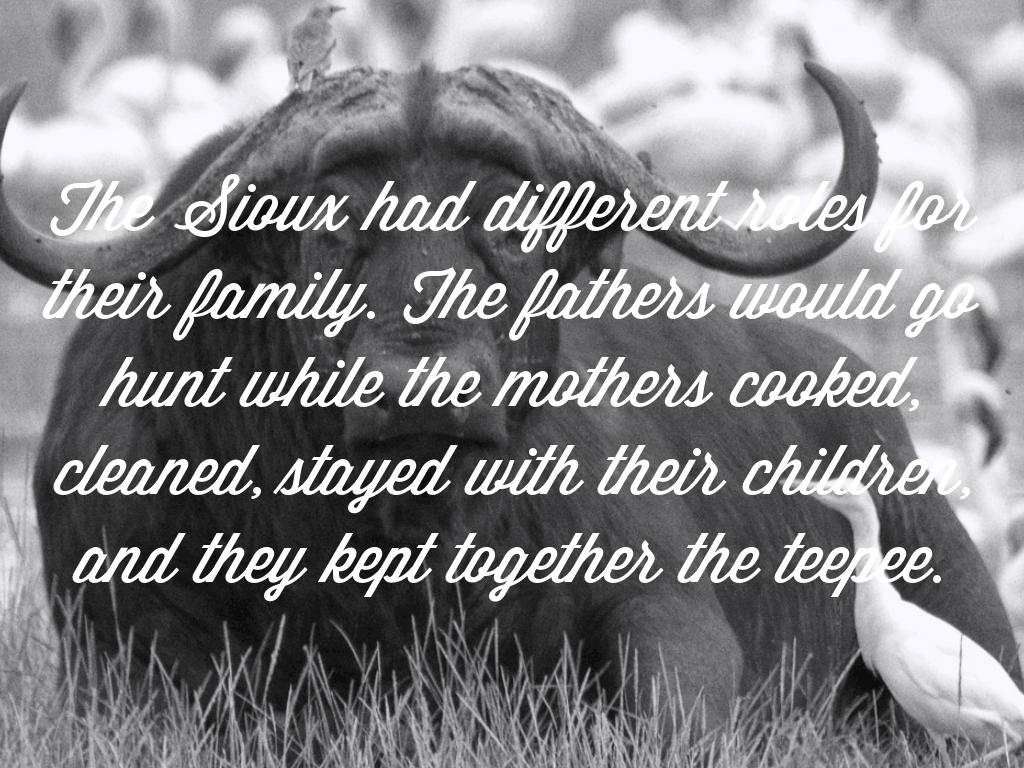 The Sioux had different roles for their family. The fathers would go hunt while the mothers cooked, cleaned, stayed with their children, and they kept together the teepee.