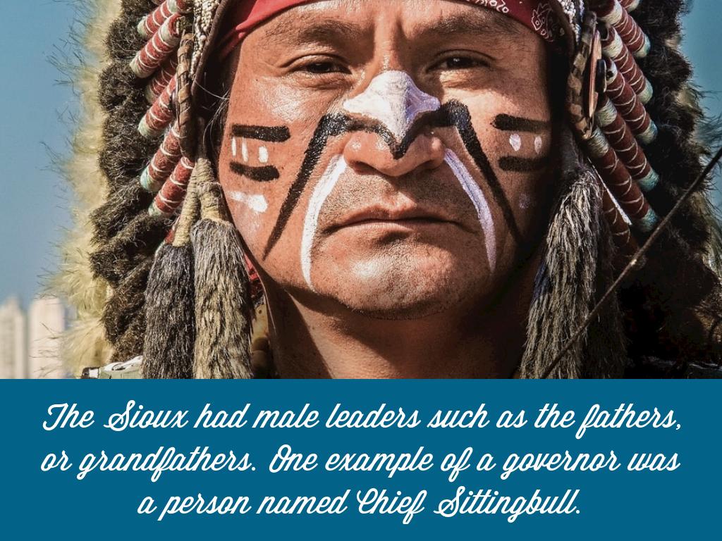 The Sioux had male leaders such as the fathers, or grandfathers. One example of a governor was a person named Chief Sittingbull.