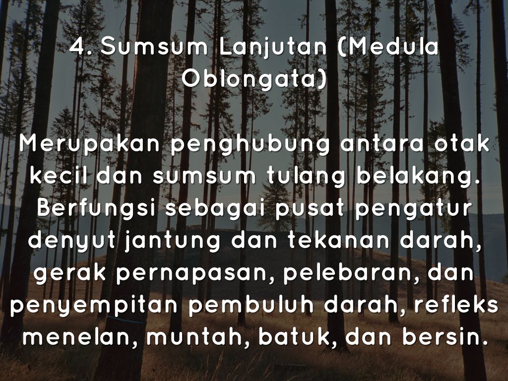 Merupakan penghubung antara otak kecil dan sumsum tulang belakang. Berfungsi sebagai pusat pengatur denyut jantung dan tekanan darah, gerak pernapasan, pelebaran, dan penyempitan pembuluh darah, refleks menelan, muntah, batuk, dan bersin.
