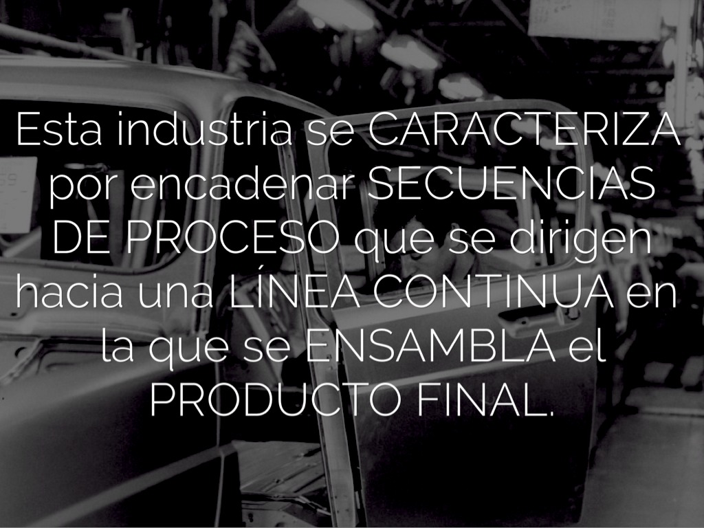 Esta industria se CARACTERIZA por encadenar SECUENCIAS DE PROCESO que se dirigen hacia una LÍNEA CONTINUA en la que se ENSAMBLA el PRODUCTO FINAL.