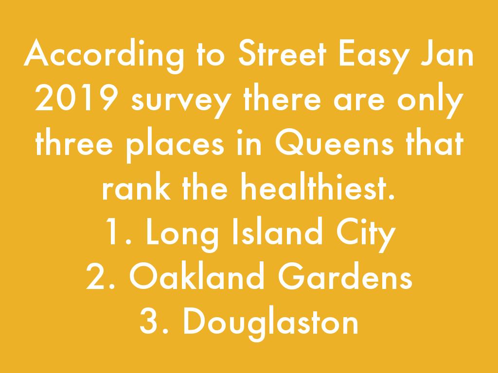 According to Street Easy Jan 2019 survey there are only three places in Queens that rank the healthiest.