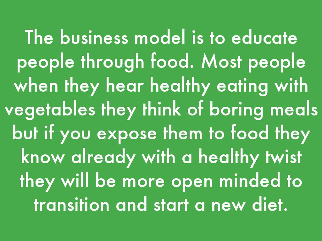 The business model is to educate people through food. Most people when they hear healthy eating with vegetables they think of boring meals but if you expose them to food they know already with a healthy twist they will be more open minded to transition and start a new diet.