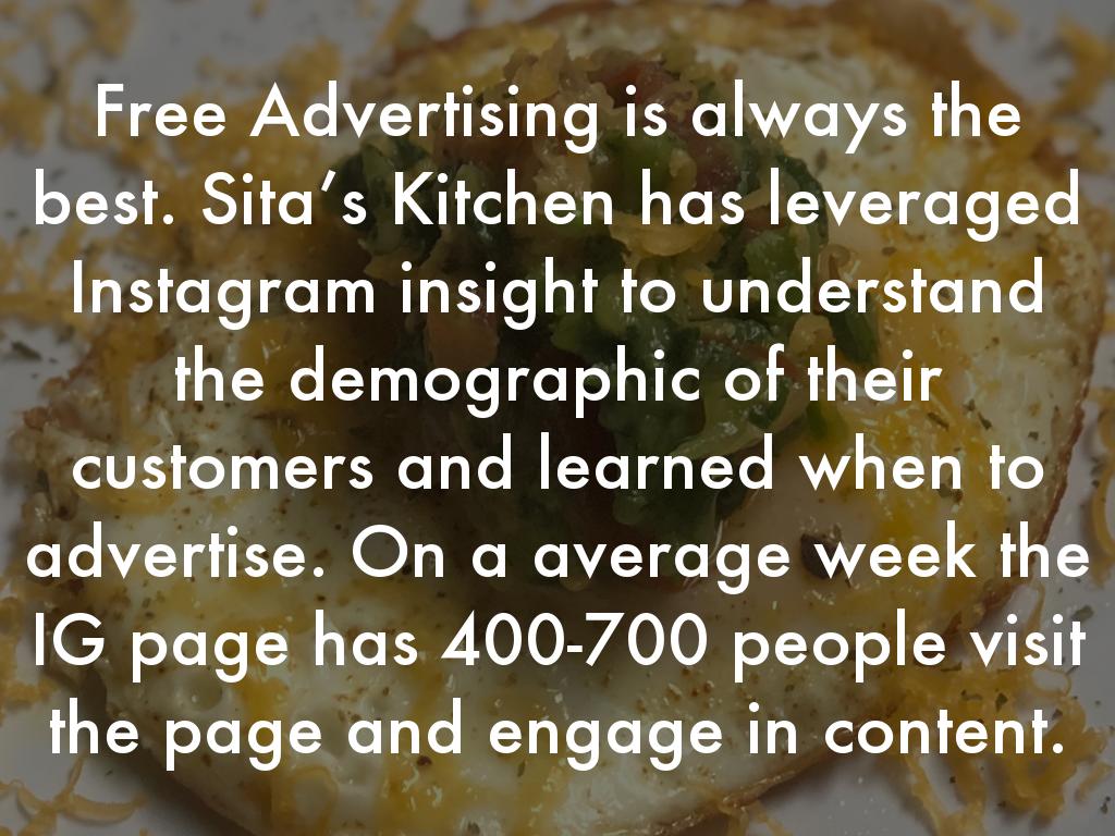Free Advertising is always the best. Sita’s Kitchen has leveraged Instagram insight to understand the demographic of their customers and learned when to advertise. On a average week the IG page has 400-700 people visit the page and engage in content.