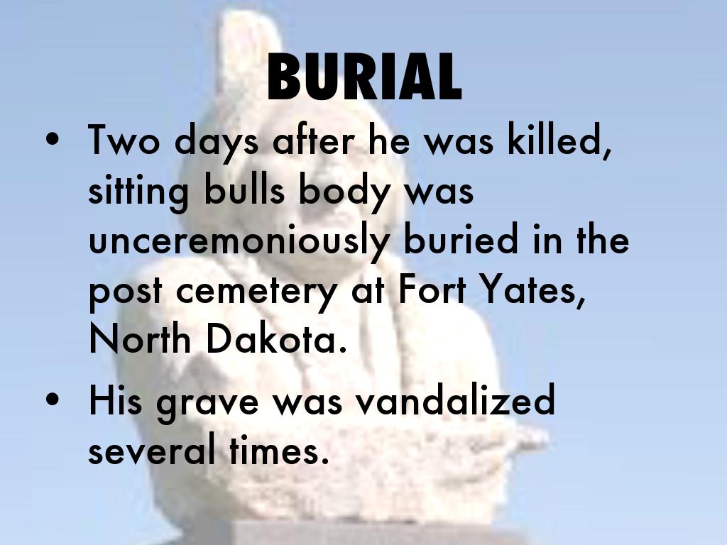 Two days after he was killed, sitting bulls body was unceremoniously buried in the post cemetery at Fort Yates, North Dakota.