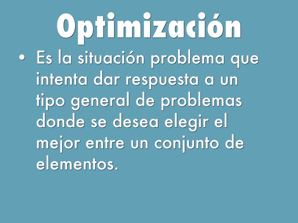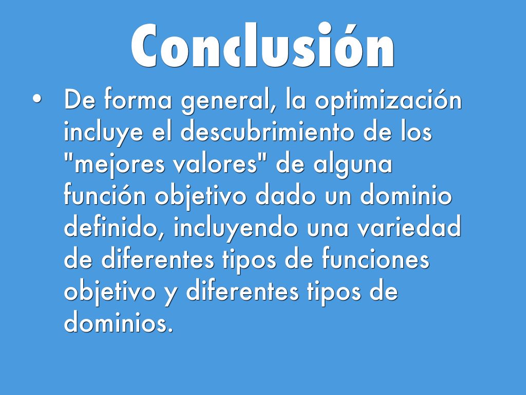 De forma general, la optimización incluye el descubrimiento de los "mejores valores" de alguna función objetivo dado un dominio definido, incluyendo una variedad de diferentes tipos de funciones objetivo y diferentes tipos de dominios.