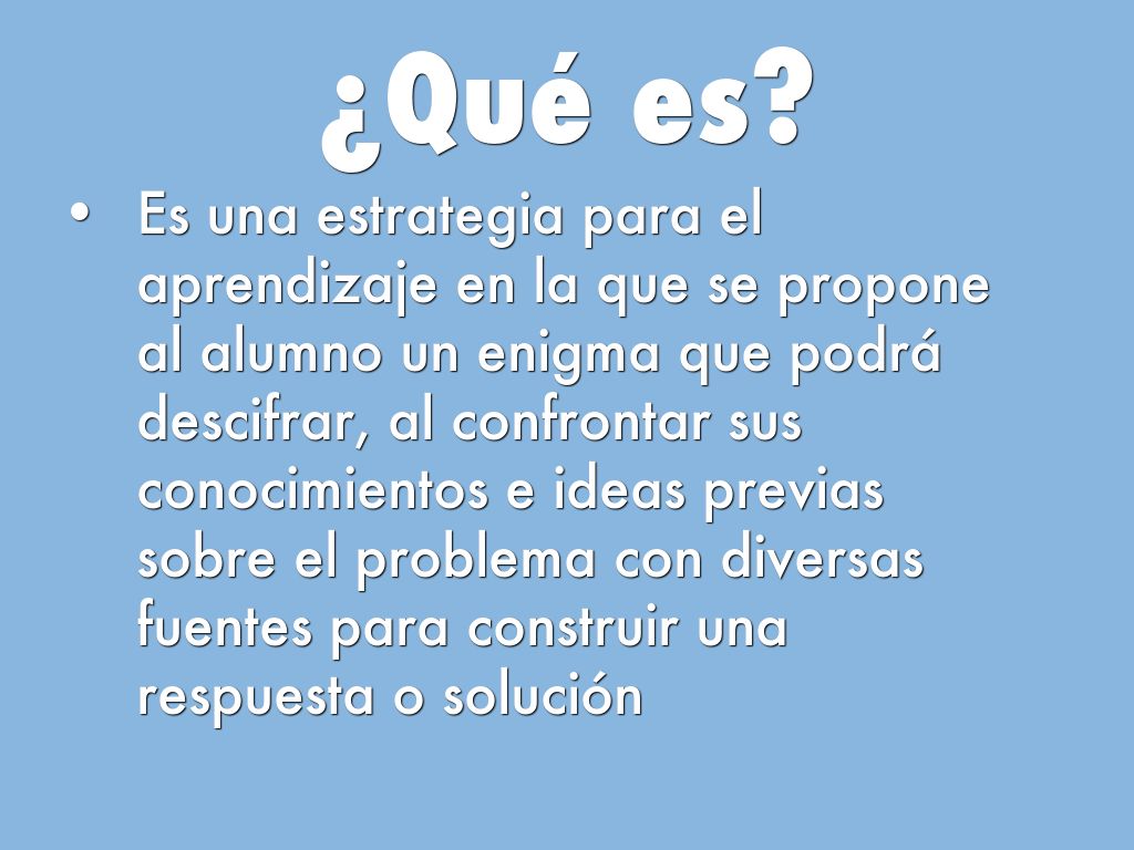 Es una estrategia para el aprendizaje en la que se propone al alumno un enigma que podrá descifrar, al confrontar sus conocimientos e ideas previas sobre el problema con diversas fuentes para construir una respuesta o solución