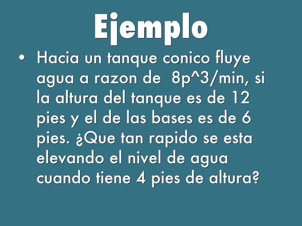 Hacia un tanque conico fluye agua a razon de 8p^3/min, si la altura del tanque es de 12 pies y el de las bases es de 6 pies. ¿Que tan rapido se esta elevando el nivel de agua cuando tiene 4 pies de altura?