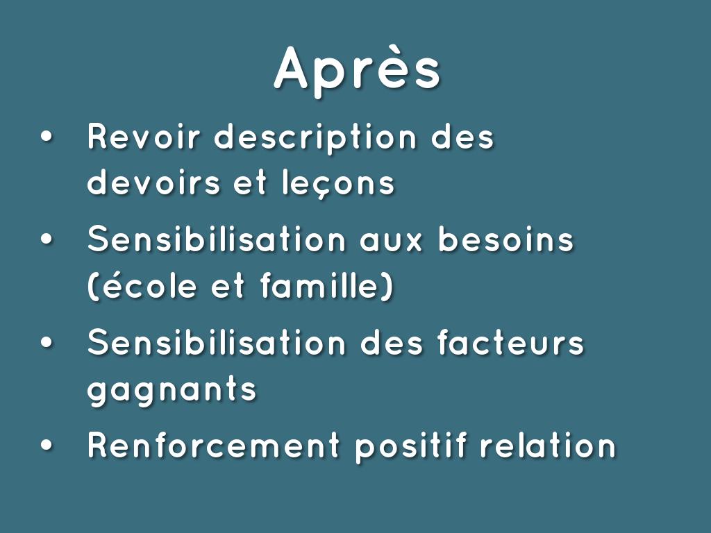 SR: intuition, calme, patience, renforcement positif, même sens que prof, rassurer enseignants, recadrer contexte (pas autres enfants), bienveillance, humilité