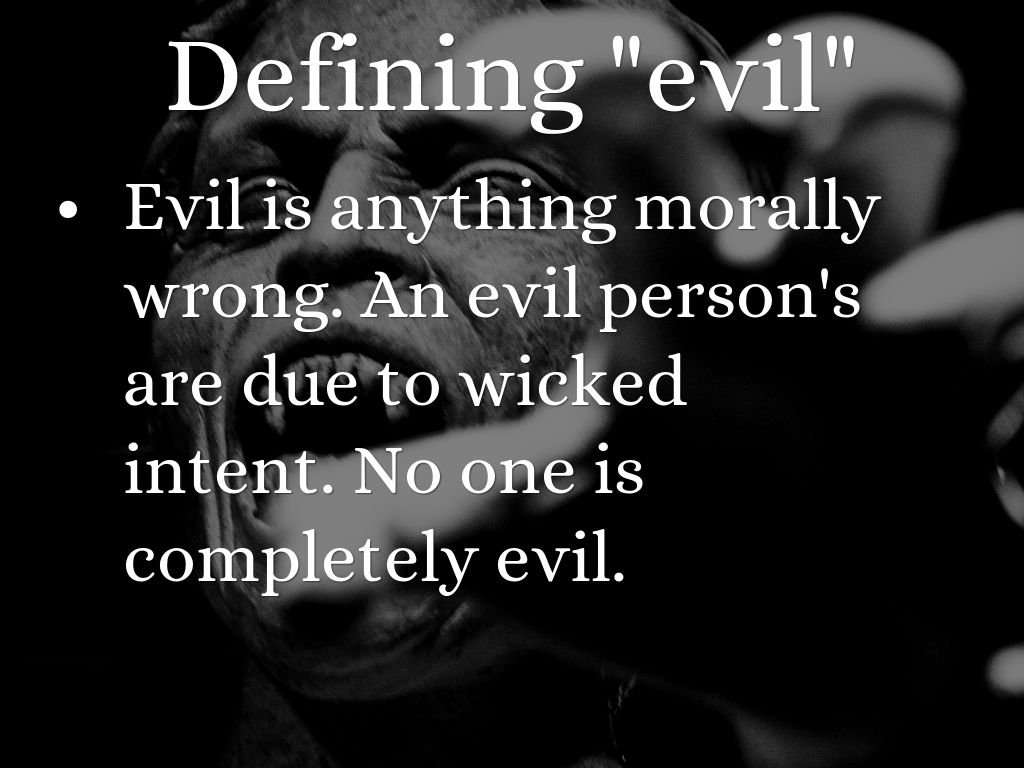 • Evil is anything morally wrong. An evil person's are due to wicked intent. No one is completely evil.