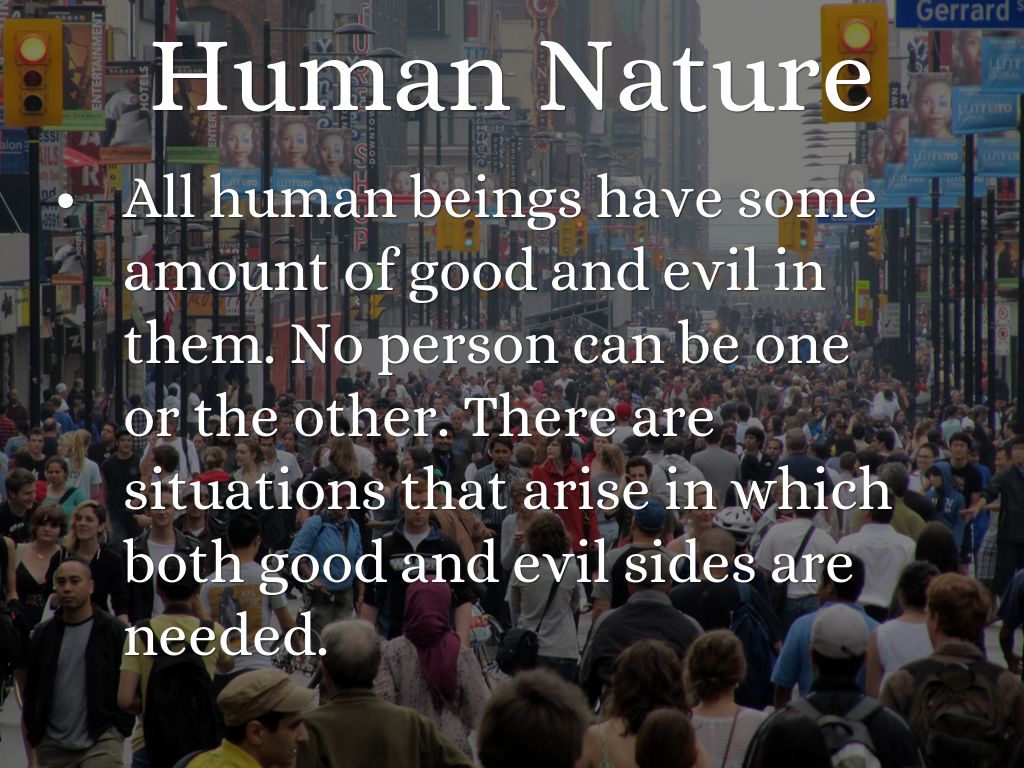 • All human beings have some amount of good and evil in them. No person can be one or the other. There are situations that arise in which both good and evil sides are needed.