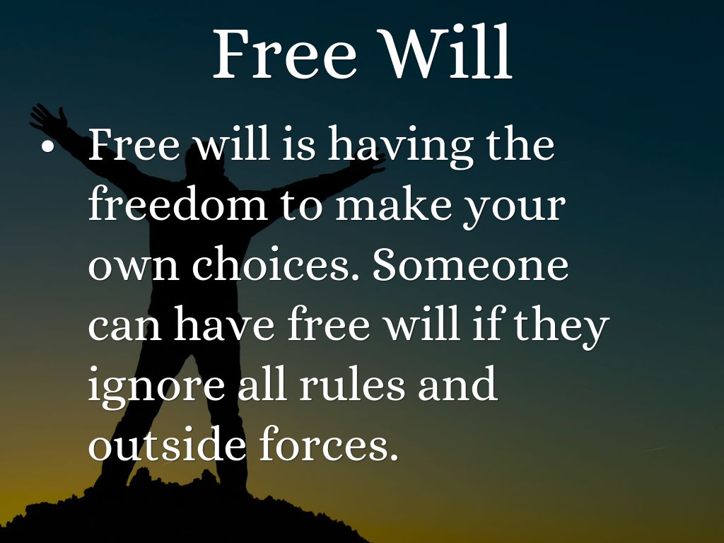 • Free will is having the freedom to make your own choices. Someone can have free will if they ignore all rules and outside forces.