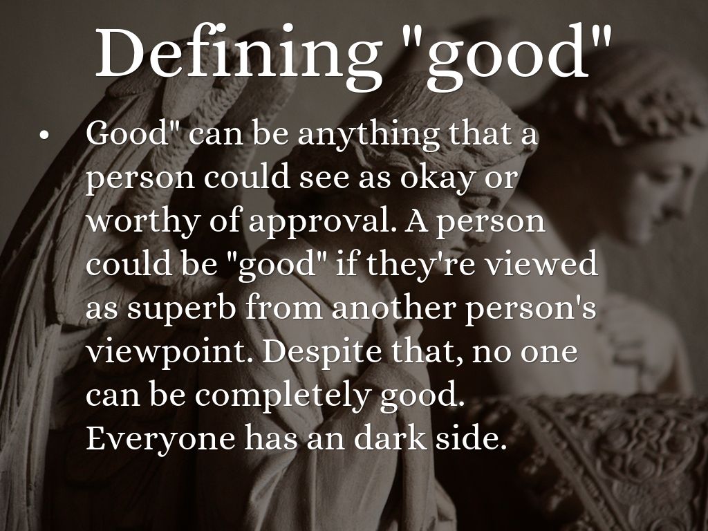 • Good" can be anything that a person could see as okay or worthy of approval. A person could be "good" if they're viewed as superb from another person's viewpoint. Despite that, no one can be completely good. Everyone has an dark side.
