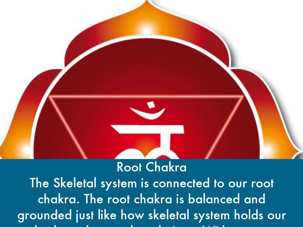 Root Chakra The Skeletal system is connected to our root chakra. The root chakra is balanced and grounded just like how skeletal system holds our body and grounds as beings. Without our skeletal system we cannot function.