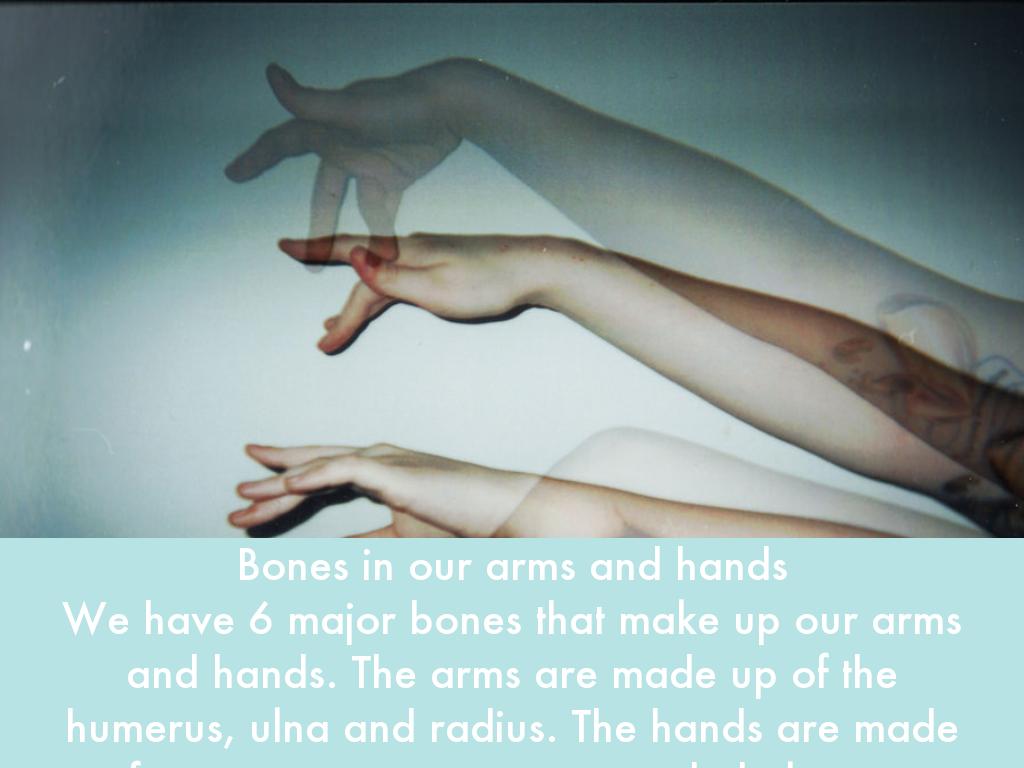 Bones in our arms and hands We have 6 major bones that make up our arms and hands. The arms are made up of the humerus, ulna and radius. The hands are made of our carpus, metacarpus, and phalanges.