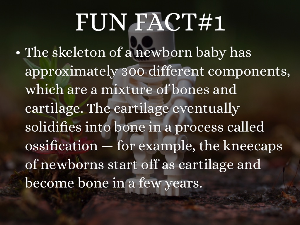 The skeleton of a newborn baby has approximately 300 different components, which are a mixture of bones and cartilage. The cartilage eventually solidifies into bone in a process called ossification — for example, the kneecaps of newborns start off as cartilage and become bone in a few years.