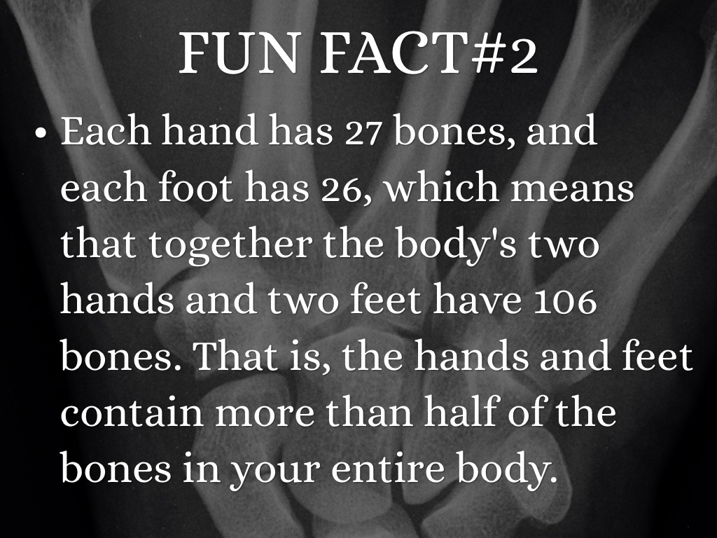 Each hand has 27 bones, and each foot has 26, which means that together the body's two hands and two feet have 106 bones. That is, the hands and feet contain more than half of the bones in your entire body.