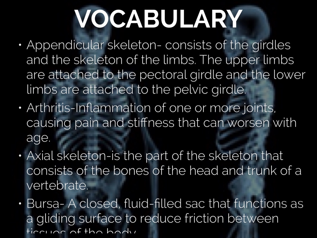 Bursa- A closed, fluid-filled sac that functions as a gliding surface to reduce friction between tissues of the body.